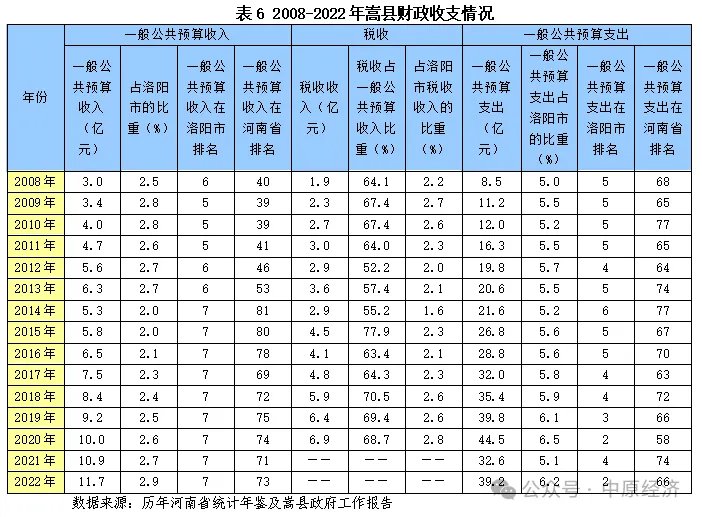 从财政收入来看,一般公共预算收入总量逐年增加,但在全省位次有所下降。2022年嵩县一般公共预算收入为11.7亿元,占洛阳市的比重为2.9%,在洛阳市下辖7个县(市)中排名第7位,在河南省下辖102个县(市)中排名第73位。从税收占比来看,嵩县税收逐年增加。2020年嵩县税收完成6.9亿元,占一般公共预算收入的比重为68.7%。从财政支出来看,嵩县一般公共预算支出2022年为39.2亿元,占洛阳市的6.2%,在洛阳市下辖7个县(市)中排名第2位,在河南省下辖102个县(市)中排名第66位(见表 6)。