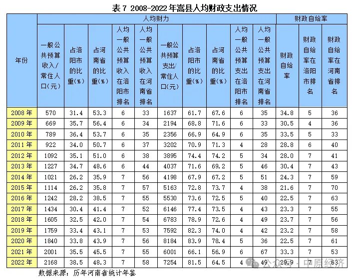 从财政自给率来看,嵩县财政自给率一直低于洛阳市和河南省平均水平。2022年嵩县财政自给率为29.9%,在洛阳市下辖7个县(市)中排名第7位,在河南省下辖102个县(市)中排名第63位(见表 7)。