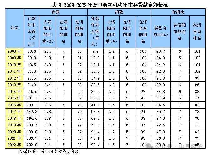 从存贷比来看,2022年嵩县存贷比为39.8%,比2008年高16.1个百分点,在洛阳市下辖7个县(市)中排名第7位,在河南省下辖102个县(市)中排名第85位。从省市对比来看,嵩县存贷比一直低于河南省和洛阳市存贷比, 2022年,低于洛阳市45.3个百分点,低于河南省41.8个百分点(见表 8)。