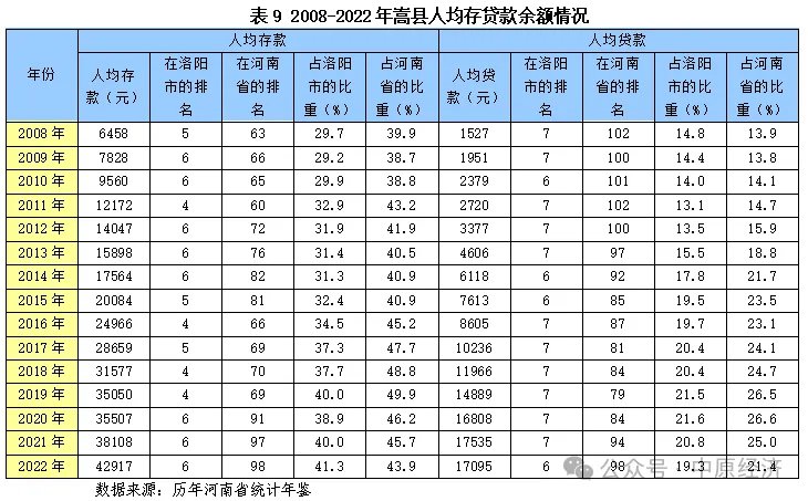 从人均存贷款余额来看,2008-2022年间,嵩县人均存贷款余额逐年增加,人均存款余额大于人均贷款余额,但均低于省市平均水平。2022年,人均存款余额为42917元,占洛阳市和河南省平均水平的41.3%和43.9%,在洛阳市下辖7个县(市)中排名第6位,在河南省下辖102个县(市)中排名第98位;人均贷款余额为17095元,占洛阳市和河南省平均水平的19.3%和21.4%,在洛阳市下辖7个县(市)中排名第6位,在河南省下辖102个县(市)中排名第98位(见表 9)。