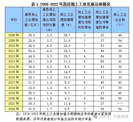 从规上工业增加值增速来看,嵩县规上工业增加值增速变化趋势与省市保持一致。2022年增速为8.5%,在洛阳市下辖7个县(市)中排名第3位,在河南省下辖102个县(市)中排名第28位(见表3)。