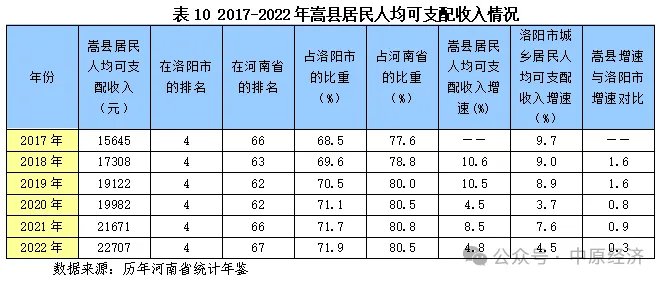 从居民家庭人均可支配收入来看,嵩县居民人均可支配收入均低于洛阳市和河南省居民可支配收入。2022年嵩县居民人均可支配收入22707元,占洛阳市和河南省平均水平的71.9%和80.5%,在洛阳市下辖7个县(市)中排名第4位,在河南省下辖102个县(市)中排名第67位(见表 10)。