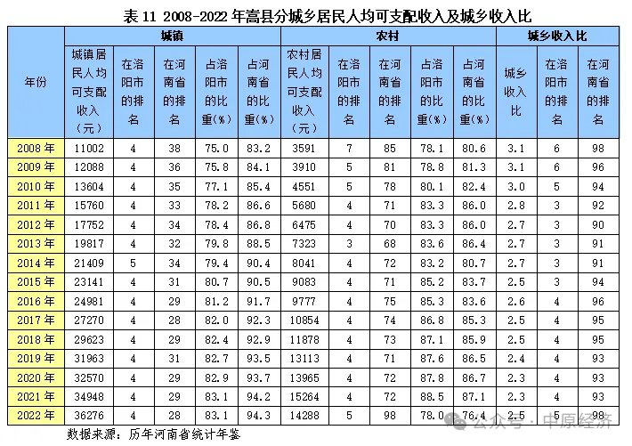 从城乡居民人均可支配收入来看,嵩县城乡居民人均可支配收入均低于洛阳市和河南省平均水平。2022年,城镇居民人均可支配收入为36276元,占洛阳市和河南省平均水平的83.1%和94.3%,在洛阳市下辖7个县(市)中排名第4位,在河南省下辖102个县(市)中排名第28位;农村居民人均可支配收入为14288元,占洛阳市和河南省平均水平的78.0%和76.4%,在洛阳市下辖7个县(市)中排名第5位,在河南省下辖102个县(市)中排名第98位。从城乡收入差距来看,城乡收入比呈逐年下降趋势,从2008年的3.1下降到2022年的2.5,在洛阳市下辖7个县(市)中排名第5位,在河南省下辖102个县(市)中排名第98位(见表 11)。