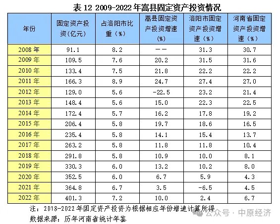 2009-2022年间,嵩县固定资产投资逐年增加。2022年,完成固定资产投资401.3亿元,占洛阳市的7.2%。从增速来看,自2017年开始,嵩县固定资产投资增速均超过洛阳市和河南省固定资产投资增速。2022年,增速为10.0%,高于洛阳市7.6个百分点,高于河南省3.3个百分点(见表 12)。
