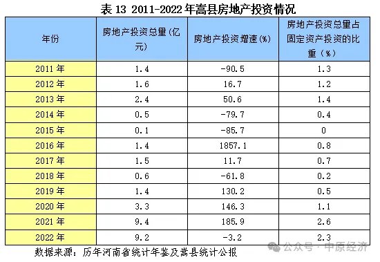 按投资分类来看,嵩县房地产投资总量较小。2022年为9.2亿元,同比下降3.2%,占固定资产投资总量的2.3%(见表 13)。