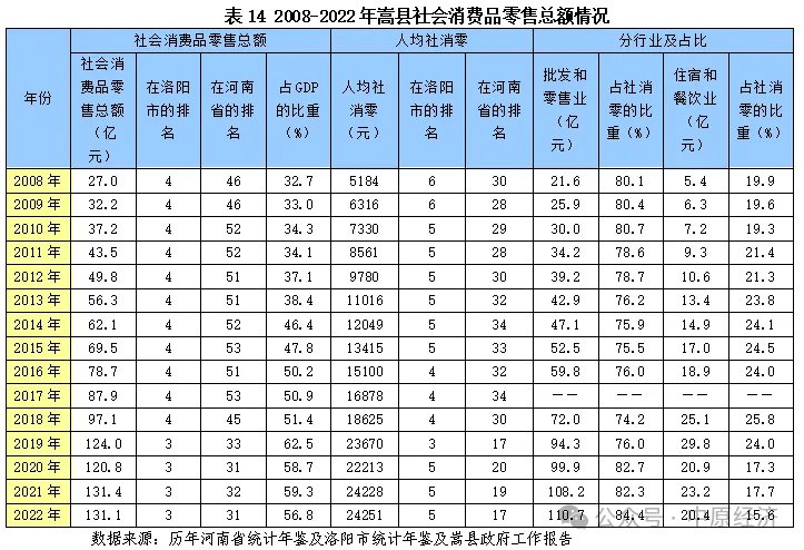 受疫情影响嵩县社消零2020年出现小幅下滑,2021年又反弹回升。2022年为131.1亿元,在洛阳市下辖7个县(市)中排名第3位,在河南省下辖102个县(市)中排名第31位。社消零占GDP比重2019年最高达到62.5%,2022年占比为56.8%。从人均社会消费品零售额来看,2022年嵩县人均社会消费品零售额为24251元,在洛阳市下辖7个县(市)中排名第5位,在河南省下辖102个县(市)中排名第17位。分行业来看,2022年批发和零售业为110.7亿元,占比为84.4%;住宿和餐饮业为20.4亿元,占比为15.6%(见表 14)。