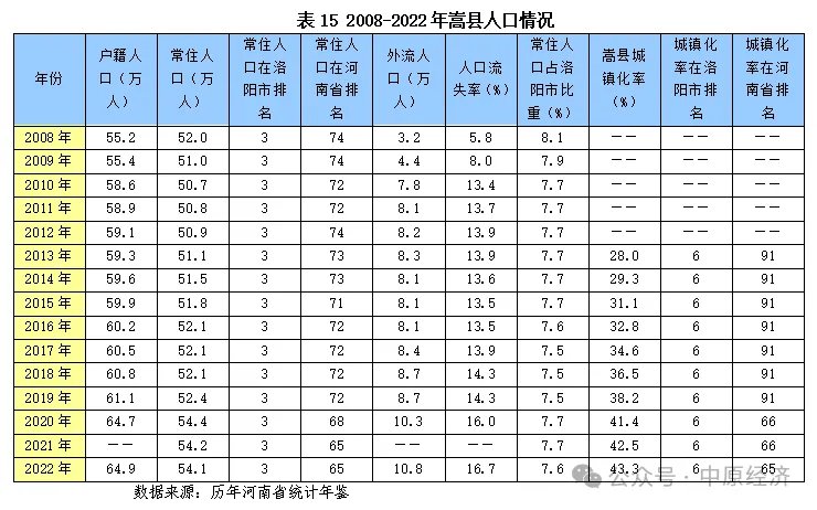 嵩县常住人口呈现先减少后增加趋势,2022年常住人口为54.1万人,占洛阳市常住人口比重为7.6%,在洛阳市下辖7个县(市)中排名第3位,在河南省下辖102个县(市)中排名第65位。2022年,外流人口增多,达到10.8万人,人口外流率达到16.7%。城镇化率快速提升,由2013年的28.0%提高至2022年的43.3%,在洛阳市下辖7个县(市)中排名第6位,在河南省下辖102个县(市)中排名第65位,但仍低于洛阳市和河南省平均水平(见表 15)。
