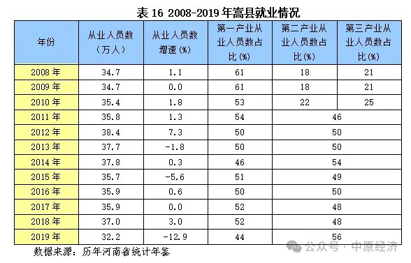 2019年嵩县就业人员为32.2万人。分产业看,第一产业就业人数占比呈现下降趋势,2019年,第一产业、第二、三产业从业人员数占比为44:56(见表 16)。