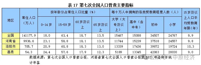 从第七次全国人口普查数据可以看到,嵩县0-14岁人口占比高于洛阳市和河南省,15-59岁人口、60岁及以上和65岁及以上人口占比均低于洛阳市和河南省,占比分别为24.4%、57.6%、17.9%和12.3%。从常住人口受教育程度来看,嵩县每十万人中拥有大学(大专及以上)学历人数省市平均水平相差较大,大学(大专及以上)学历人数占全省的44.2%、占洛阳市的38.9%(见表 17)。
