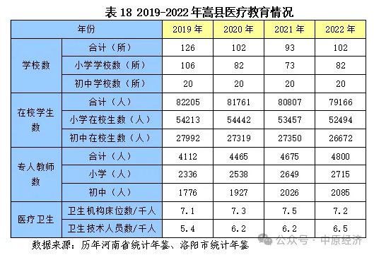 教育情况,2022年嵩县有小学82所,在校生52494人,专任教师2715人,生师比19.3:1。初中20所,在校生26672人,专任教师2085人,生师比12.8:1。医疗卫生方面,嵩县每千人卫生机构床位数和每千人卫生技术人员数逐年增加。2022年每千人卫生机构床位数为7.2,每千人卫生技术人员数为6.5(见表 18)。