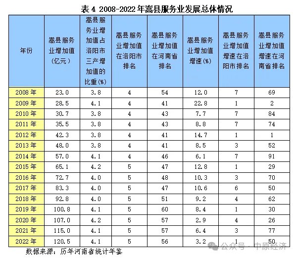 再看服务业,2008年以来嵩县服务业增加值不断提升,到2022年实现增加值总额120.5亿元,占洛阳市服务业增加值的4.1%,在洛阳市下辖7个县(市)中排名第5位,在河南省下辖102个县(市)中排名第56位。从增速看, 2022年嵩县服务业增加值增速为3.2%,在洛阳市下辖7个县(市)中排名第1位,在河南省下辖102个县(市)中排名第50位(见表4)。