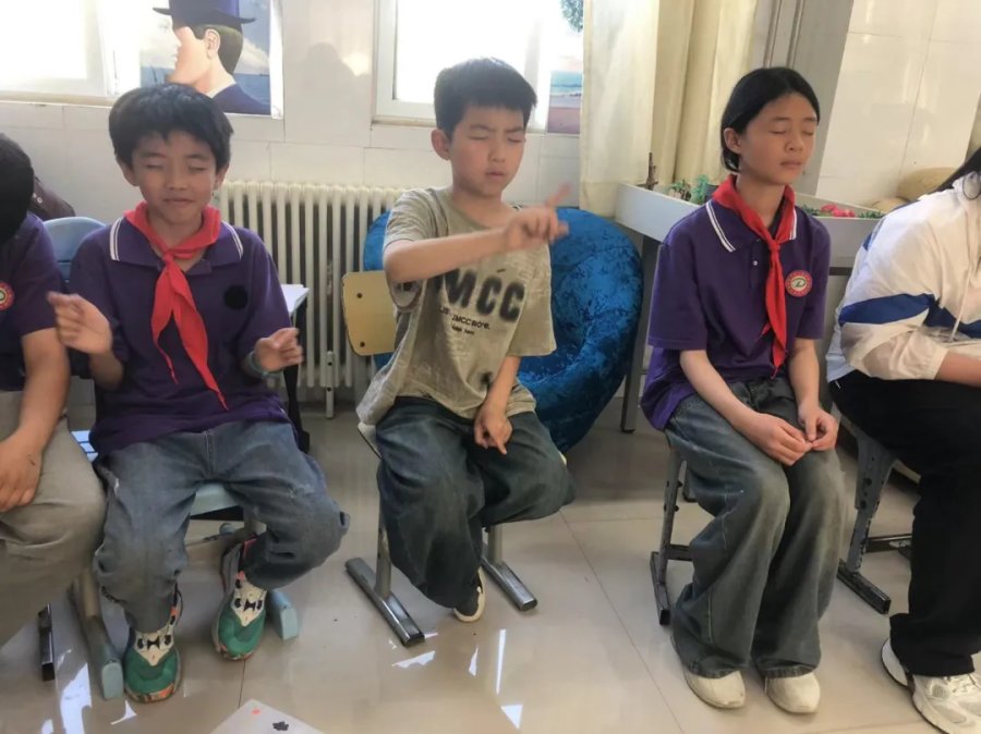 赵晓洁老师让学生听着音乐在纸上随着音乐画音乐的波动,认真倾听笔在纸上滑动摩擦的声音。赵老师接着让学生闭上眼睛听音乐,手随着音乐进行舞动,放松身心投入到音乐中。