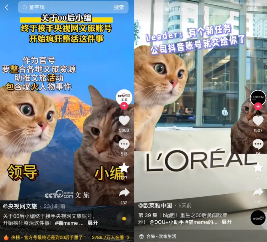很多官方社媒账号也加入整活,让一批00后猫meme来接管官号运营,进行科普。