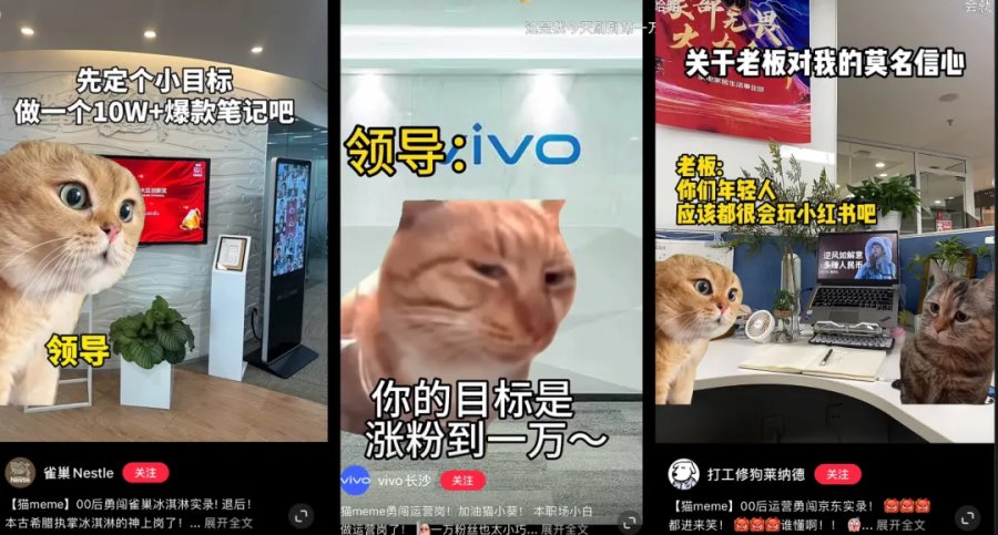 上述套路的“重生之我在xx公司当运营”成为很多品牌的猫meme vlog模版,虽然内容雷同度高,但由于这些打工版的猫meme们主要是00后的职场形象,主打一个脆皮、开朗、自信,也拉近了品牌官号与年轻用户之间的距离。