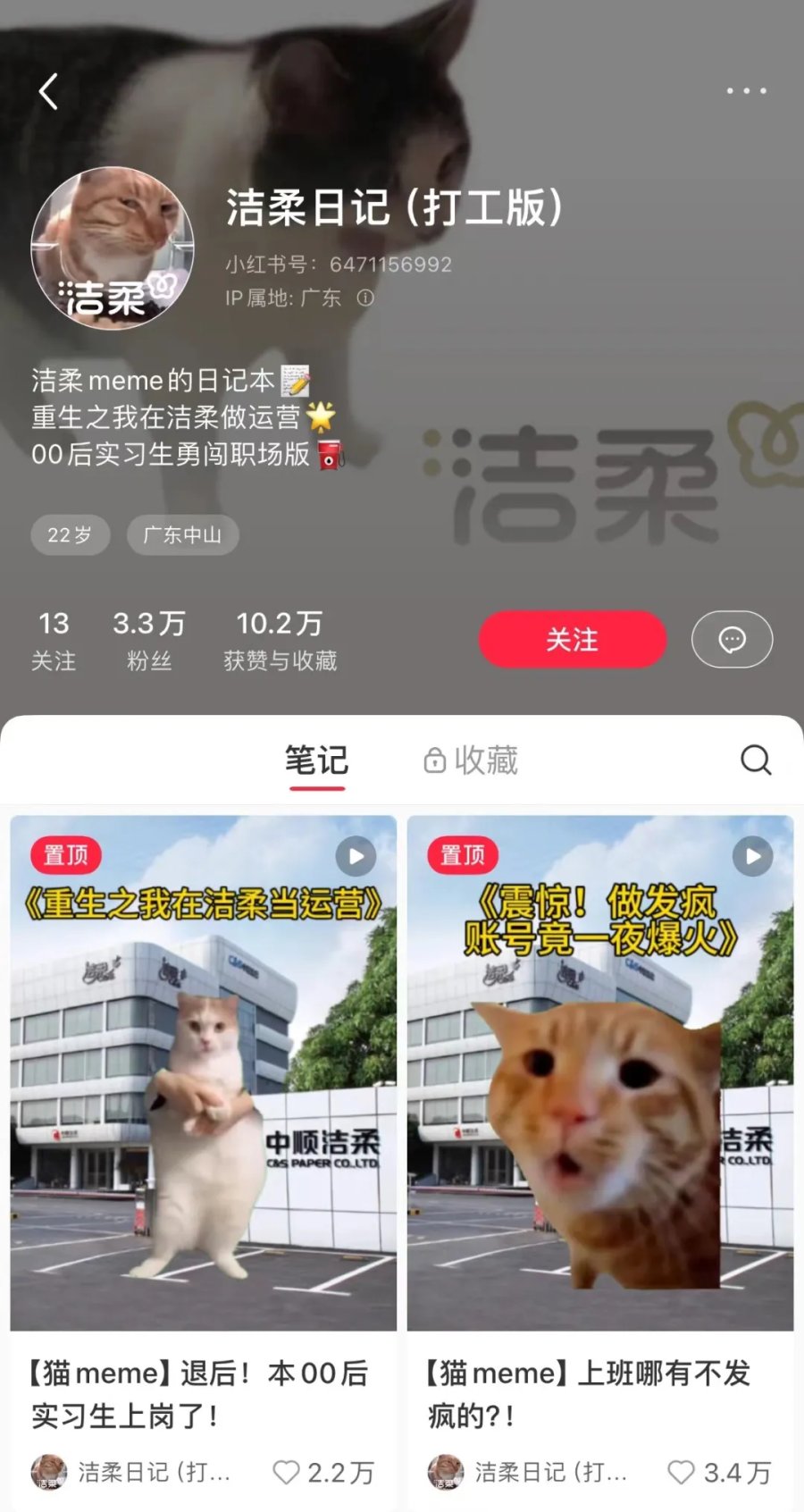 洁柔还开了专属的猫meme小红书账号@洁柔日记(打工版),发布了“重生之我在洁柔偷纸”、“打工人的八大美德”、“重生之我与董事长硬碰硬”等精神状态美好、疯感满满的内容。该账号4月8日发布了第一支猫meme vlog,目前粉丝量已达3.3万。