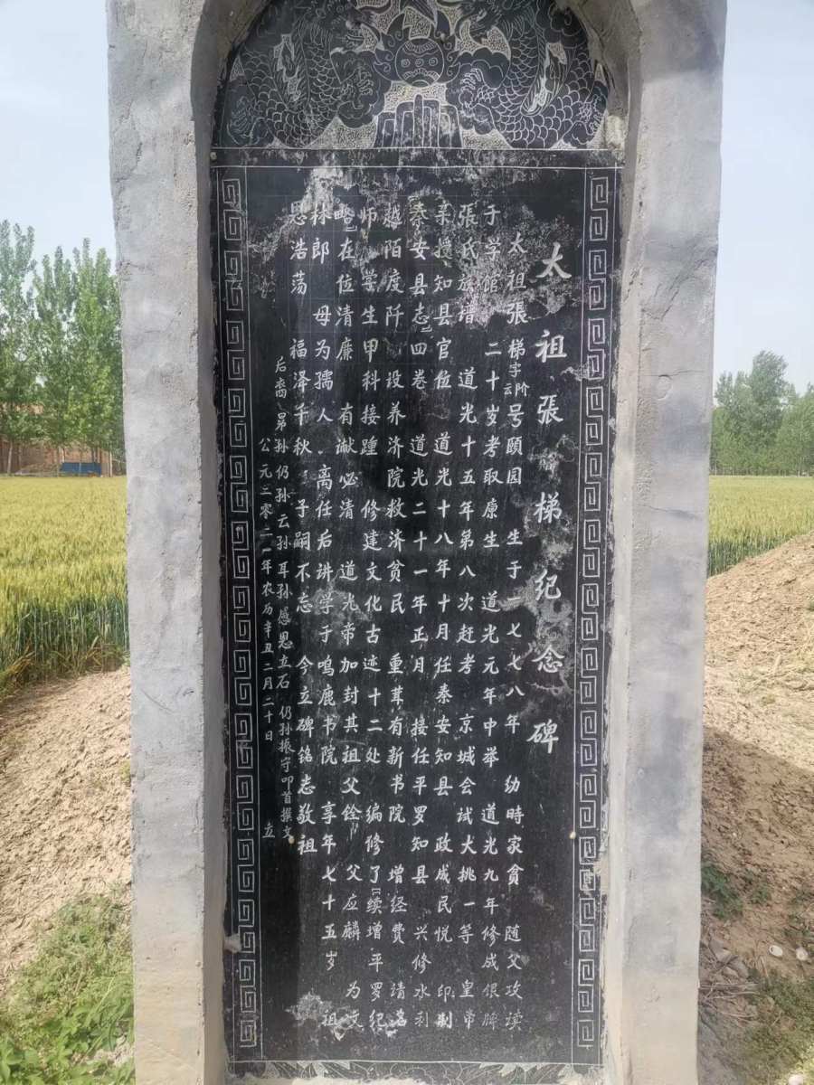 在村南祖坟地,是张氏家族第二十世孙至第二十三世孙于2022年春季筹资重修。墓碑上刻着十世祖公至十六世祖公的生平事迹介绍:十世祖公讳星,字纯九,武痒生(武将官名),公之张楼村唯始祖,于清康熙四十八年(公元1709年)由四羊寨村中院迁居于张楼村,原配张氏生子士傑,副室生子世傑;十一世祖公讳世傑,字季哲,太学生(明朝、清朝时太学即国子监的俗称,在国子监就读的学生即被称作“太学生”),德配吴氏生儿二子潘、玙。孙为三益、振纲、六益,曾孙为桓;十一世祖公讳士傑,字淑良,德配郭氏生五子佩、鏸、储、钧、铨。孙为发祥、正祥、履祥、兆祥、集祥、景儒、应麟;曾孙为果、杲、继、路、振、敬、辰、骏、梯;十二世祖公讳铨,字衡齐,以孙子张梯为贵,勅赠文林郎(清朝时为正七品文官),公学识渊博,教书传道,尽瘁鞠躬,桃李满园,学子称颂,祖妣闫氏生子应麟。孙梯于清道光年间任甘肃省秦安县知县、平罗县知县;十三世祖公讳应麟、字鲁一,号竹溪,邑痒生(清朝时期秀才),勅封文林郎,公天资过人,学术纯正,曾任教于鸣鹿书院,名扬邑里,待人宽厚仁慈,识者皆重其德,卒于嘉庆戊辰年(公元1808年),享年81岁;十四世祖公张梯(公元1778年一1853年),字云阶,号颐园……