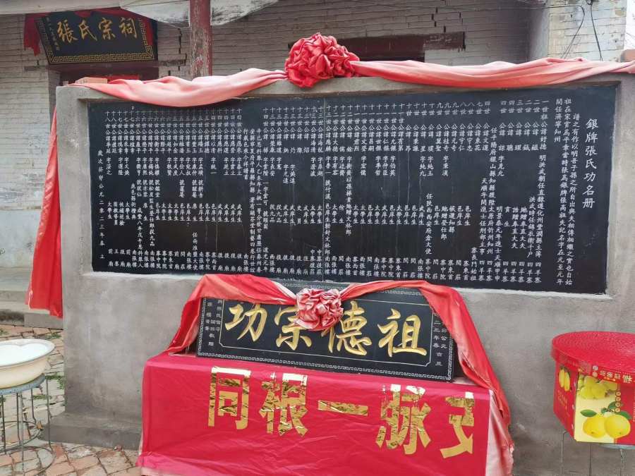 来到院内,映入眼帘的是上方悬挂着红绣球的长方形“银牌张氏功名册”石碑,上面刻着有成就的一世祖公至十八世公部分简介生平,下方书有“祖德宗功”四字长方形小石碑。后面是三间古朴的宗祠建筑房屋,门上方是悬挂书有“张氏宗祠”黄色大字的石匾。走进屋内,正堂中间摆放着一世祖公至四世祖公牌位。