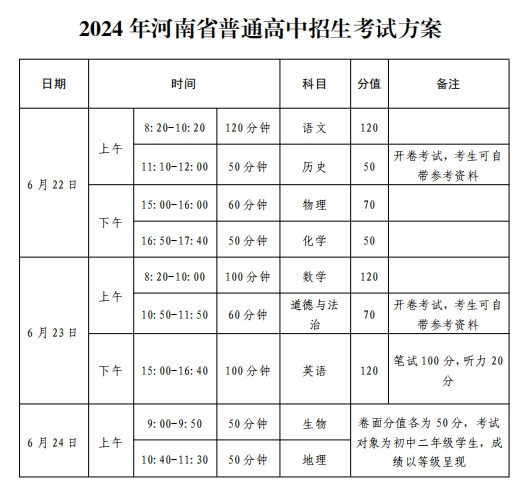 今年的考试依然为全省统一命题考试,考试时间为:6月22日——24日,科目为语文、数学、英语、物理、化学、道德与法治、历史、生物、地理。