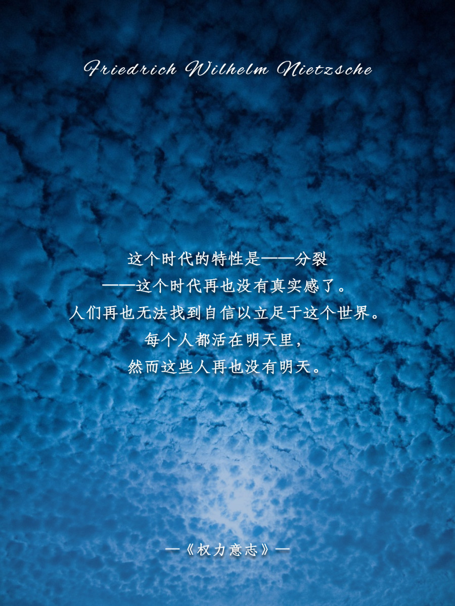 这个时代的特性是——分裂——这个时代再也没有真实感了。人们再也无法找到自信以立足于这个世界。每个人都活在明天里,然而这些人再也没有明天。