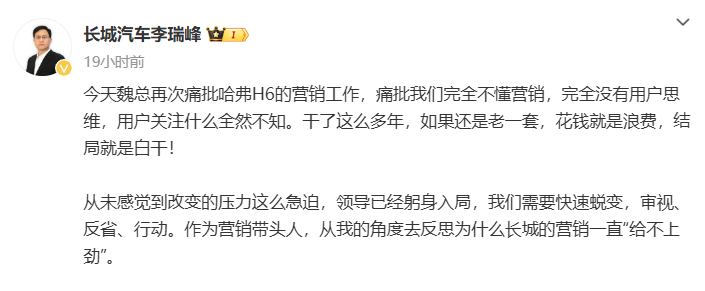 5月20日,长城汽车CGO李瑞峰发文称,在最近一次内部会议上,魏建军再次痛批公司旗下哈弗H6的营销策略,指责管理层缺乏用户思维和市场敏感性。
