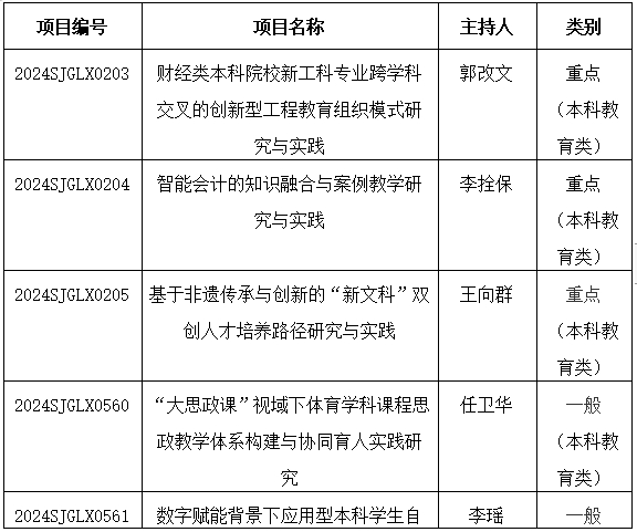 近年来,该校高度重视高等教育教学改革研究与实践工作,积极引导广大教师深入研究新时代实现高等教育内涵式发展的措施和方法,及时更新教育教学理念,创新人才培养模式,加强专创融合教育,深化人工智能、大数据、互联网等现代信息技术在教学中的运用,构建科学的质量保障体系,形成了良好的教学育人生态。本次获批立项的项目,聚焦新时代高等教育教学研究的关键领域,研究和破解教育教学中的重点和难点问题,积极探索人才培养新机制、新模式和新举措,对于进一步提升我校高等教育教学改革研究与实践水平,深入推进“四新”建设、实践教学改革、课程思政建设、创新创业教育、产教融合发展等方面均具有积极作用。