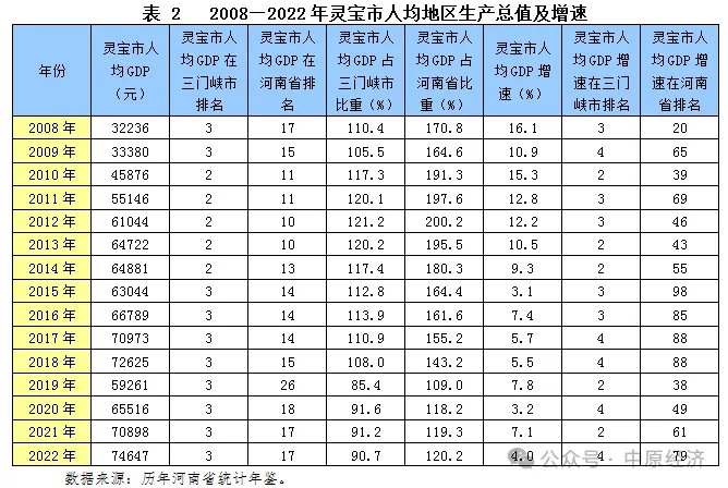 从人均GDP来看,灵宝市人均GDP始终高于河南省平均水平,但近两年低于三门峡市平均水平。2022年,灵宝市人均GDP为74647元,占三门峡市的90.7%,占河南省的120.2%,在三门峡市4个县(市)中排第3位,在河南省102个县(市)中排第17位(见表2)。