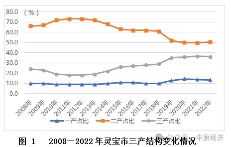 工业是灵宝市经济社会发展的支柱行业,近几年虽然占比呈现下降趋势,但仍高于第三产业占比,三次产业结构为“二、三、一”梯次。2022年灵宝市三产结构为13.5:50.4:36.1(见图1)。