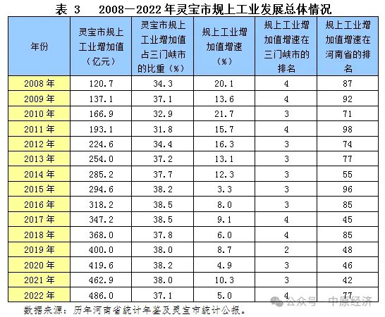 2008以来灵宝市规上工业增加值占三门峡市的比重呈上升趋势,2022年占比为37.1%。从增速来看,在2011年、2018年、2021年和2022年低于三门峡市,在2009年、2011年、2015年、2018年和2022年低于河南省,2022年增速为5.0%,低于三门峡市2.4个百分点,低于河南省0.1个百分点,在三门峡市4个县(市)中排第4位,在河南省102个县(市)中排第77位(见表3)。