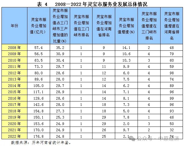 自2009年以来,灵宝市服务业增加值逐年增长。2022年,灵宝市服务业增加值达176.8亿元,在三门峡市4个县(市)中排第1位,在河南省102个县(市)中排第25位。从服务业增加值增速来看,2022年,灵宝市服务业增加值增速为2.1%,在三门峡市4个县(市)中排第3位,在河南省102个县(市)中排第74位(见表4)。