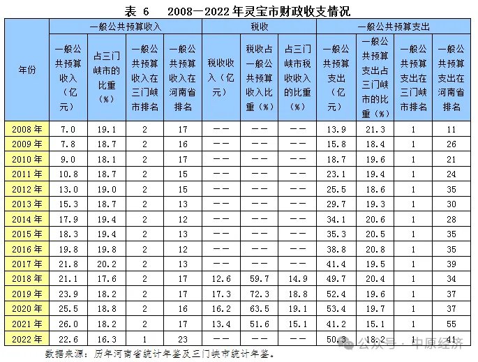 从财政收支总体情况来看,灵宝市一般公共预算收入在河南省县域中处于上游位次,一般公共预算支出在河南省县域排名中略有下降。2022年,灵宝市一般公共预算收入达22.6亿元,占三门峡市一般公共预算收入的16.3%,在三门峡市4个县(市)中排第1位,在河南省102个县(市)中排第23位。其中,税收收入2021年达到13.4亿元,占灵宝市一般公共预算收入的51.6%,占三门峡市税收收入的15.1%。2022年,灵宝市一般公共预算支出达到50.3亿元,占三门峡市一般公共预算支出的18.2%,在三门峡市4个县(市)中排第1位,在河南省102个县(市)中排第41位(见表6)。