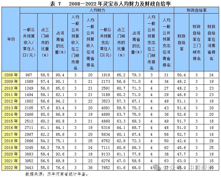 从人均财力看,灵宝市人均一般公共预算收支均不及三门峡市和河南省的人均水平。2022年,灵宝市人均一般预算公共收入为3443元,占三门峡市人均一般预算公共收入的55.0%,占河南省人均一般预算公共收入的76.6%,在三门峡市4个县(市)中排第3位,在河南省102个县(市)中排第36位;人均一般公共预算支出达到7652元,占三门峡市人均一般公共预算支出的61.6%,占河南省人均一般公共预算支出的68.0%,在三门峡市4个县(市)中排第4位,在河南省102个县(市)中排第37位。从财政自给率看,灵宝市财政自给率始终高于河南省财政自给率。2022年,灵宝市财政自给率为45.0%,低于三门峡市5.4个百分点,高于河南省5.1个百分点,在三门峡市4个县(市)中排第3位,在河南省102个县(市)中排第40位(见表7)。