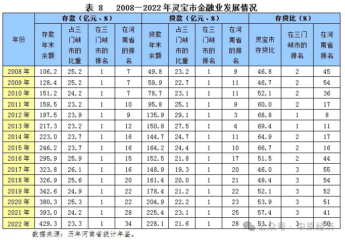 灵宝市金融机构年末存贷款余额逐年增加。2022年,金融机构存款年末余额为429.3亿元,占三门峡市的23.3%,在三门峡市4个县(市)中排第1位,在河南省102个县(市)中排第34位;金融机构贷款年末余额为228.0亿元,占三门峡市的21.6%,在三门峡市4个县(市)中排第1位,在河南省102个县(市)中排第28位。2008年以来灵宝市存贷比呈现波动上升趋势,2017年以来逐渐上升,与三门峡市存贷比水平接近。2022年存贷比为53.1%,在三门峡市4个县(市)中排第3位,在河南省102个县(市)中排第50位(见表8)。
