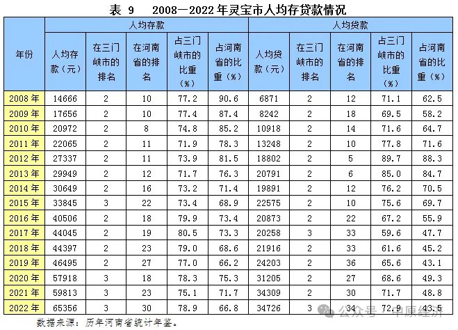 从人均存贷款来看,灵宝市人均存款余额在河南省、三门峡市的排名均处于中上游。2022年,灵宝市人均存款余额为65356元,占三门峡市人均存款余额的78.9%,占河南省人均存款余额的66.8%,在三门峡市4个县(市)中排第3位,在河南省102个县(市)中排第30位;人均贷款余额为34726元,占三门峡市人均贷款余额的72.9%,占河南省人均贷款余额的43.5%,在三门峡市4个县(市)中排第3位,在河南省102个县(市)中排第34位(见表9)。