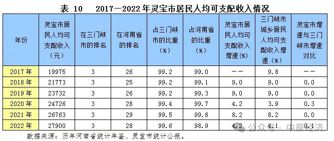 从居民收入看,2017年以来灵宝市居民人均可支配收入在河南省排名处于中上游。2022年,灵宝市居民人均可支配收入为27900元,占三门峡市居民人均可支配收入的99.6%,占河南省居民人均可支配收入的98.9%,在三门峡市4个(市)中排第3位,在河南省102个县(市)中排第28位。从居民收入增速看,2022年,灵宝市居民人均可支配收入增速为4.2%,高于三门峡市居民人均可支配收入增速0.1个百分点(见表10)。