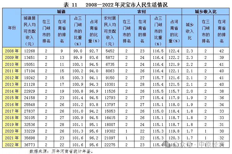 分城乡来看,灵宝市城镇居民人均可支配收入高于三门峡市,但低于河南省平均水平;农村居民人均可支配收入始终高于河南省和三门峡市平均水平。2022年,灵宝市城镇居民人均可支配收入为36773元,占三门峡市城镇居民人均可支配收入的101.6%,占河南省城镇居民人均可支配收入的95.6%,在三门峡市4个县(市)中排第2位,在河南省102个县(市)中排第22位;农村居民人均可支配收入为22275元,占三门峡市农村居民人均可支配收入的115.4%,占河南省农村居民人均可支配收入的119.1%,在三门峡市4个县(市)中排第2位,在河南省102个县(市)中排名第23位;城乡居民人均可支配收入比约为1.7,在三门峡市4个县(市)中排第1位,在河南省102个县(市)中排第34位,处在中上游水平,2008年以来城乡收入差距整体上逐步缩小(见表11)。