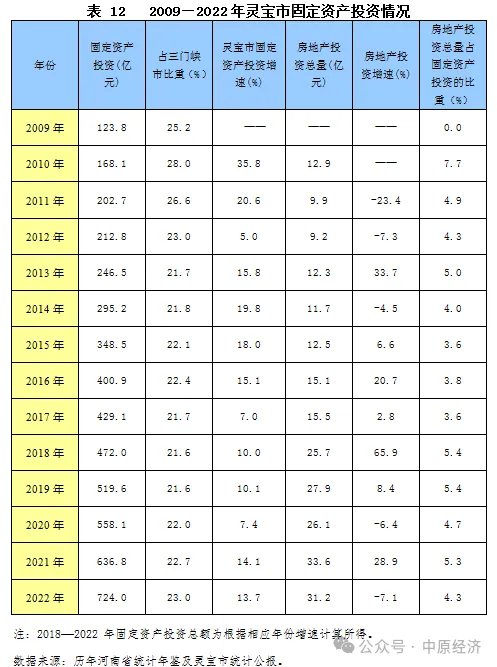 固定资产投资逐年增加,2022年达到724.0亿元,占三门峡市的比重为23.0%。固定资产投资增速整体呈下降趋势,2022年为13.7%,高于三门峡市1.3个百分点,高于河南省7.0个百分点。2022年,房地产投资为31.2亿元,增速为-7.1%(见表12)。