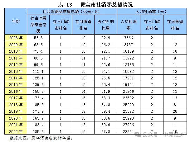 从社会消费情况来看,灵宝市社消零总额和人均社消零在河南省、三门峡市的排名均处于上游。2022年,灵宝市社消零总额为185.6亿元,在三门峡市4个县(市)中排第1位,在河南省102个县(市)中排第16位;人均社消零2022年达28254元,在三门峡市4个县(市)中排第2位,在河南省102个县(市)中排第10位(见表13)。