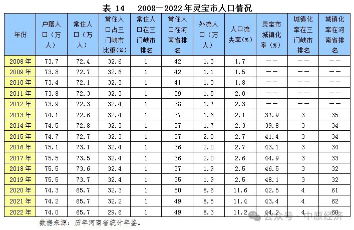 从人口情况看,灵宝市常住人口在河南省县域中排名处在中游,城镇化率水平在河南省县域中排名处在中下游。2022年,灵宝市常住人口为65.7万人,占三门峡市常住人口的29.6%,在三门峡市4个县(市)中排第1位,在河南省102个县(市)中排第49位。2022年,人口外流8.3万人,人口流失率为11.2%。2022年,城镇化率为44.2%,在三门峡市4个县(市)中排第4位,在河南省102个县(市)中排第60位(见表14)。