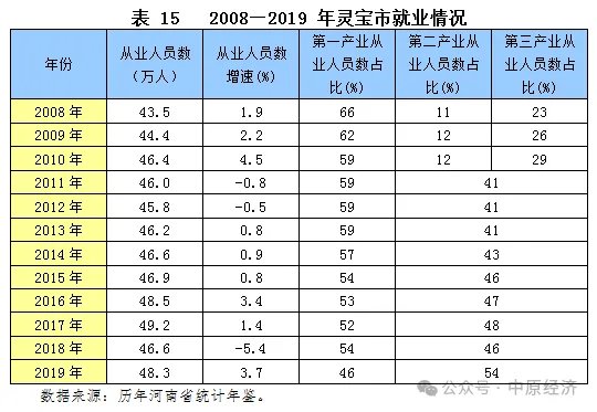 灵宝市从业人员数在2011年、2012年和2018年出现下降,从业人员增速在2011年、2012年和2018年也低于河南省、三门峡市从业人员增速。2019年,灵宝市从业人员数为48.3万人,同比上升3.7%(见表15)。其中,城镇从业人员占比47.7%,低于第二、第三产业从业人员占比54%,说明仍有一部分乡村从业人员从事第二、第三产业活动。