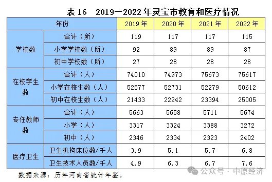 从教育情况来看,2022年,灵宝市有小学87所,在校生50612人,专任教师3272人,生师比15.5∶1;初中28所,在校生25005人,专任教师2402人,生师比10.4∶1。