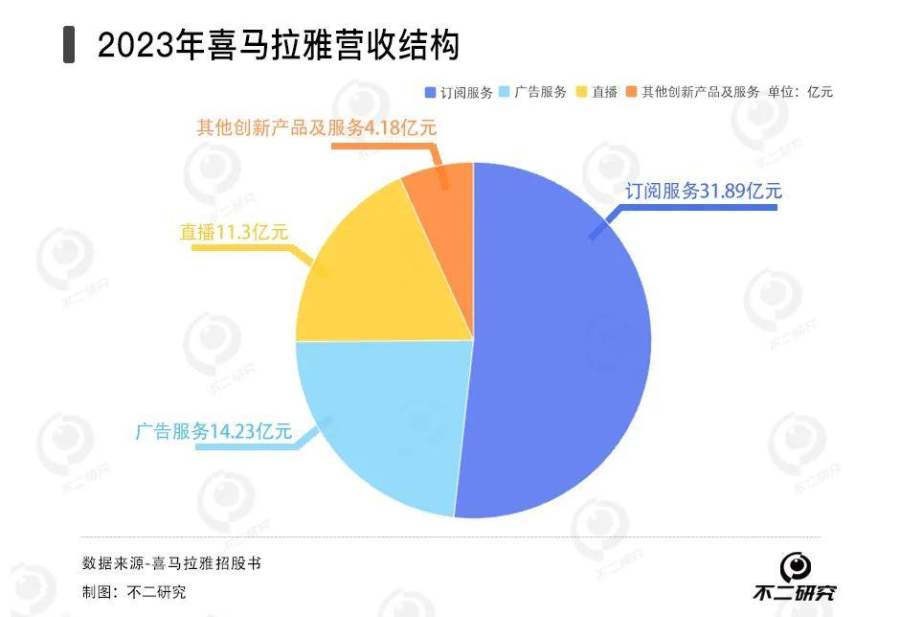 拆解2023年的营收结构:来自订阅服务的营收为31.89亿元,来自广告服务的营收为14.23亿元,来自直播的收入为11.3亿元,来自其他创新产品及服务的营收为4.18亿元。