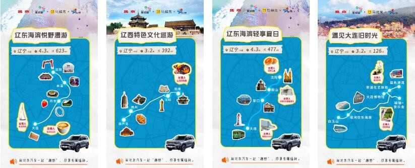北京汽车第一站牵手辽宁省文旅厅,在“辽宁省第一届文旅体融合发展大会”上,为 “自驾中国,悦享计划”揭幕,推出“辽东海滨悦野漫游”、“辽西特色文化巡游”、“辽东海滨轻享假日”、“遇见大连旧时光”四条辽宁主题自驾线路。线路围绕辽宁本地特色,充分挖掘辽宁旅游资源,将滨海休闲、海上运动、城市探索、文化、美食等方面的全新玩法体验尽数囊括,是自驾探索辽宁的绝佳之选。