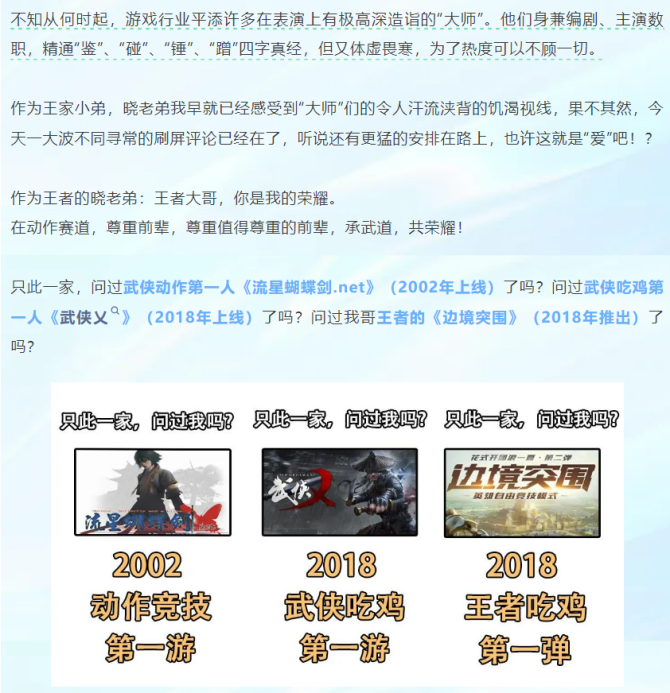 距离《永劫无间》发文一个半小时之后,《王者荣耀:星之破晓》也不惯着,回击了一篇文章《王者,你是我的荣耀》。质疑《永劫无间》标榜自己“武侠吃鸡,只此一家”的夸大宣传,指出自家投资的《流星蝴蝶剑.net》、《武侠乂》,研发的《王者荣耀》“边境突围”模式推出时间均早于《永劫无间》,以此论证网易“蹬鼻子上脸”蹭热度。