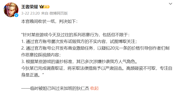 当晚《王者荣耀》在微博上发布声明称,针对某些游戏今天及过往的系列恶意行为,已完成调查取证,将采取法律措施予以严肃回击。