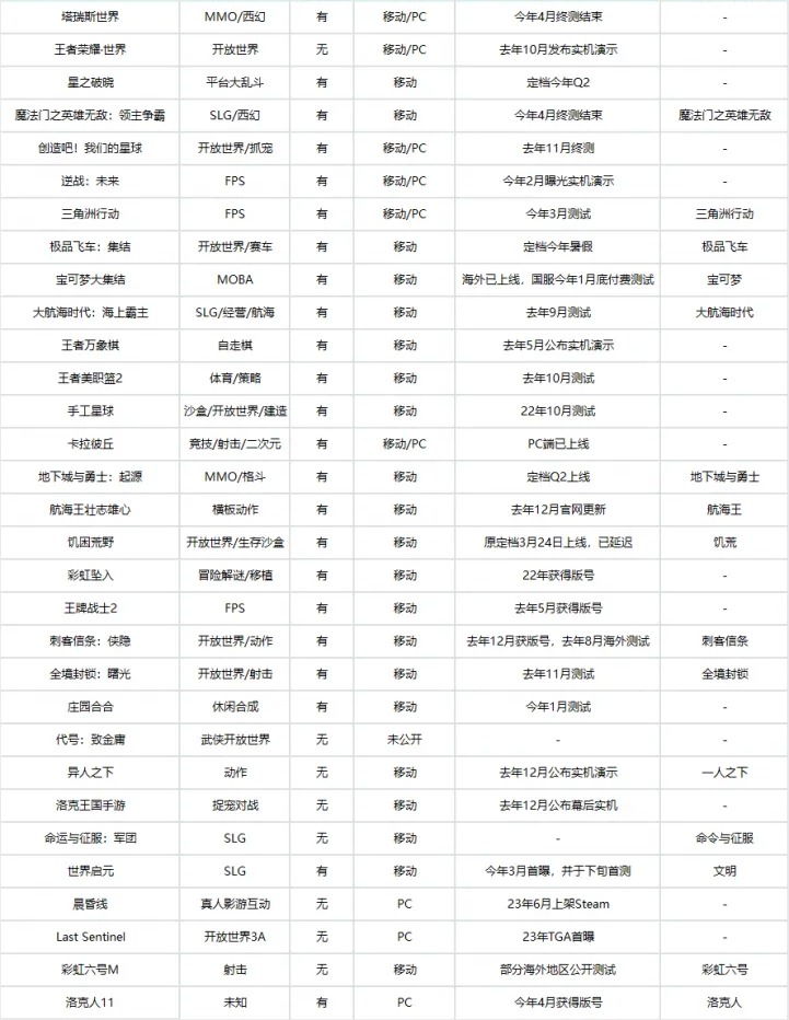而观察腾讯今年手握待发的产品,一类是发行《宝可梦大集结》《极品飞车》《英雄无敌》《刺客信条》《大航海时代》《航海王》等影视或游戏IP手游,主要是满足粉丝群体的需求,靠正统、自带流量跑出个别爆款。一类是《王者世界》《逆战:未来》《洛克王国》《异人之下》这类腾讯王牌工作室参与研发的人气项目,在大IP的基础上为团队技术力做“军演”,展示项目开发能力和游戏创新能力,但整体看来腾讯还是在庞大的流量基础上做加减法。