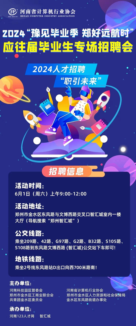 6月1日(周六)上午, 河南科技园区管委会、 郑州市金水区工商业联合会、金水区人力资源和社会保障局、 共青团金水区委员会 、河南省计算机行业协会、 金水区东风路街道办事处联合河南123人才网,将在智汇城 室内一楼大厅举办——“豫见毕业季 郑好远航时”应往届毕业生专场招聘会活动。