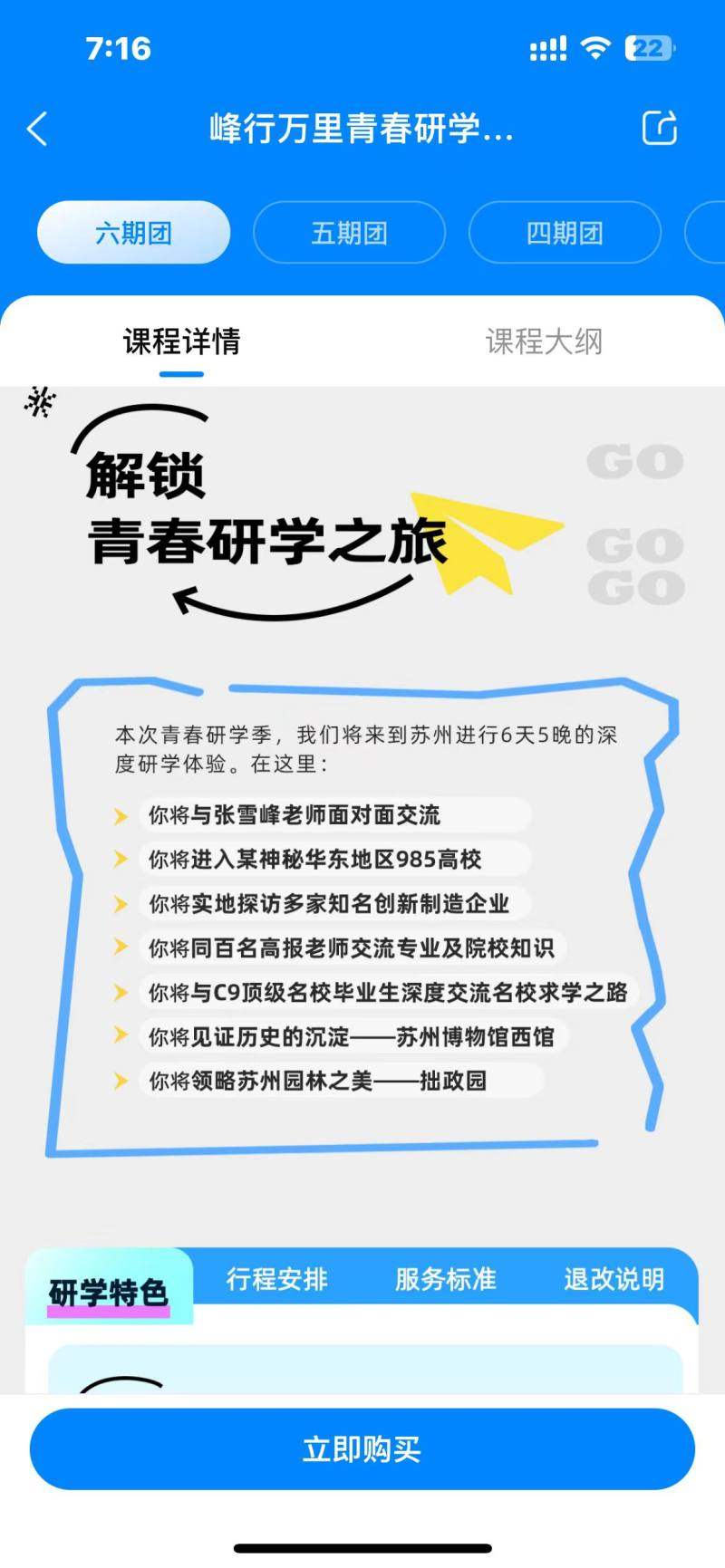 峰学蔚来APP显示,“峰行万里青春研学营”行程包括985高校与知名企业实地探访,时间为6天5晚,售价为8999元(不包含来回交通)。这一定价显然高于目前市面上的大多数研学营,但当研学与“择业”挂钩,溢价也变成了“情绪价值”。