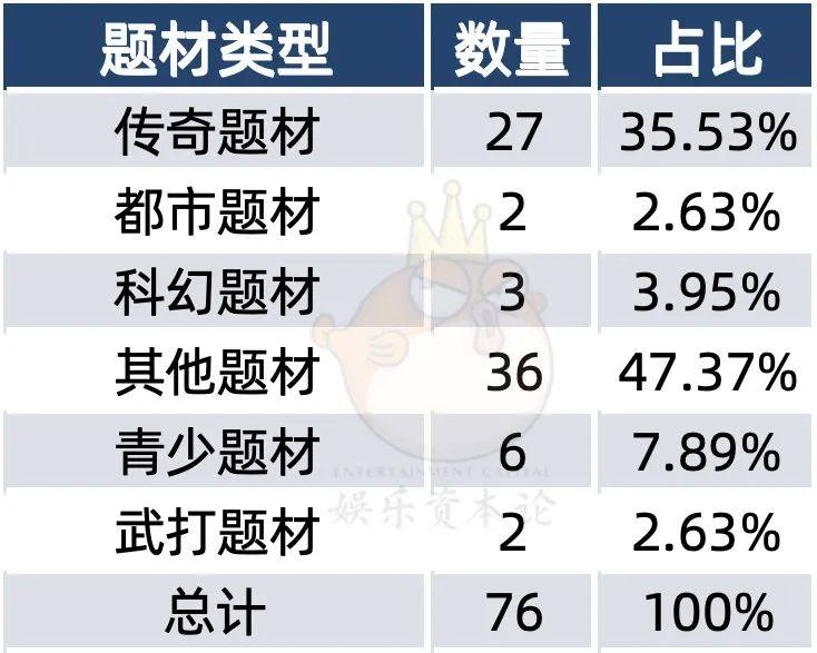在题材方面,其他题材占比最高,共36部387集,占总备案数量的47.37%,其次是传奇题材27部279集,占总备案数量的35.53%,青少年题材6部137集,科幻题材3部49集,都市题材2部38集,武打题材2部46集。