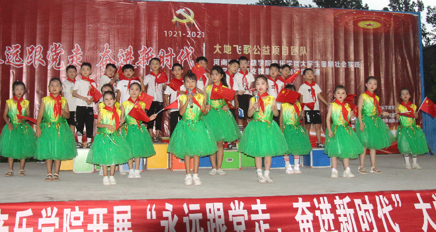 硕果悬枝砥砺奋进。“大地飞歌”项目从2019年12月实施以来,克服疫情、水灾等重重困难,师生赴府庄小学支教累计授课百余课时,受教学生8000多人次;在府庄小学和焦作市博爱县张茹集小学开展集中音乐培训2期,共计20余天,受教学生近200人;举办主题红色文艺演出2场。该项目被河南电视台都市频道、商都网、中原网、河南商报、中国搜索等多家媒体进行报道。