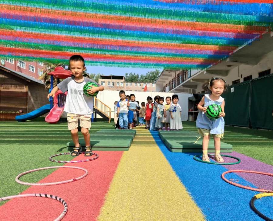 在幼儿园户外体育活动中也会生成很多有关“西瓜”的游戏。比如孩子们喜欢玩的“西瓜皮球”,小班的孩子想象力不够丰富,需要我们带领孩子一起玩,百变花样的玩,只有当孩子玩的次数多了,体验不同的游戏玩法,他才能慢慢去创造新的游戏玩法。户外活动,我们带着西瓜皮球到草坪上,我说:“今天我们玩球,这个皮球就是一个大西瓜,我们一起来玩运西瓜吧”。运西瓜的方法有很多种,两人合作运西瓜,也有自己一个人抱着西瓜从起点跳到终点,对小班孩子而言,合作运西瓜是有难度的,所以他们更喜欢自己一个人抱着西瓜跑或者是跳,本次游戏我们借助垫子、呼啦圈,孩子要抱着西瓜匍匐爬过垫子,再跳过呼啦圈才算胜利。第二种玩法,“幸福传递”,这个相对比较简单,全班幼儿分成两队,每队第一个小朋友抱着球依次传递给下一位小朋友,哪组最先传完即为获胜。